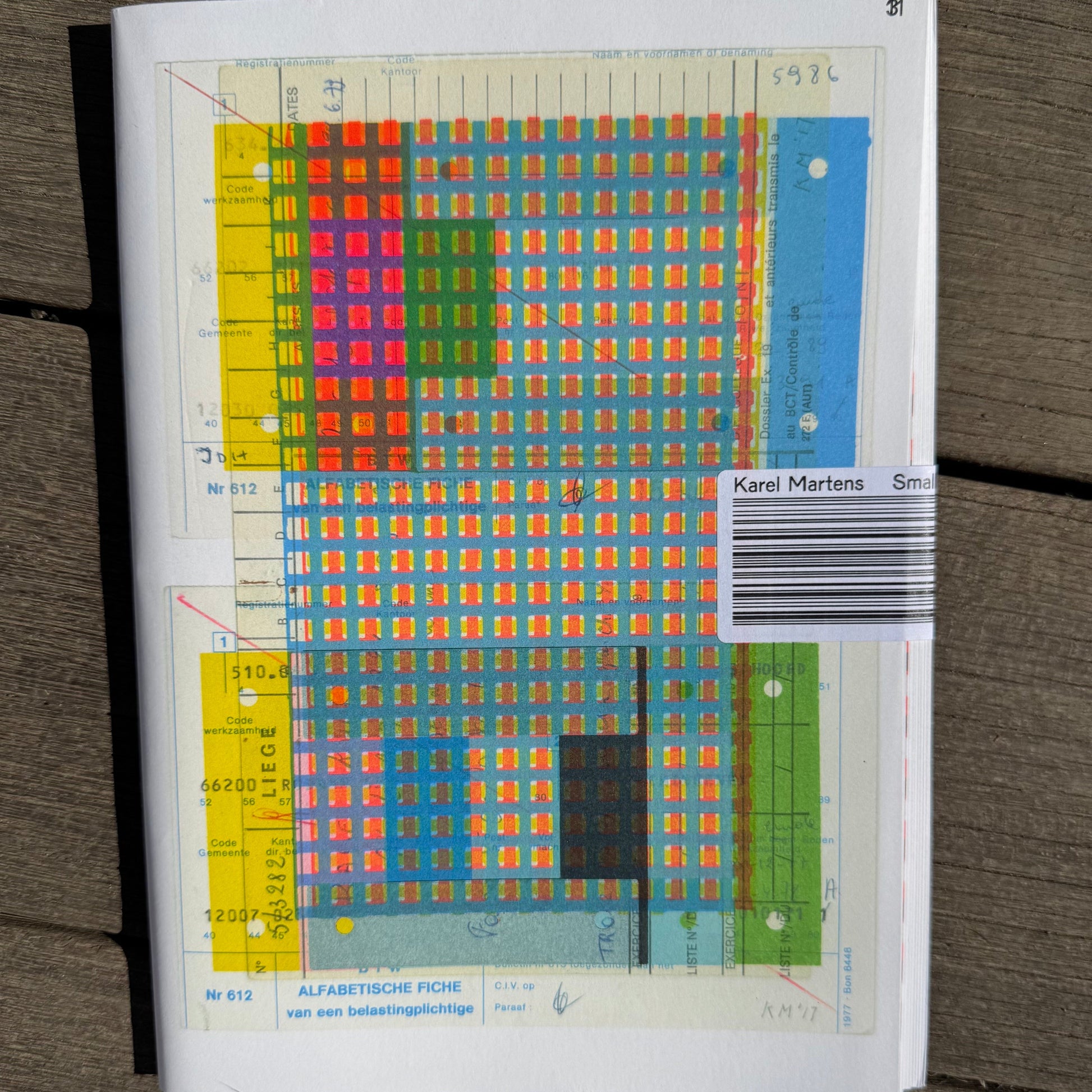 This artist’s publication contains a sequence of unique letterpress monoprints, made by Dutch graphic designer Karel Martens between 2014 and 2022. The prints, which are both highly geometric and brightly colored, are reproduced in the book at their actual size. Textual elements accent the various abstract shapes and repetitions on almost every page. ‘Small Prints’ is available in two different cover versions, which itself is the result of a printing experiment. By printing the contents of the book in three layers on a single print sheet, which was then cut and folded, variations in the cover emerged.
